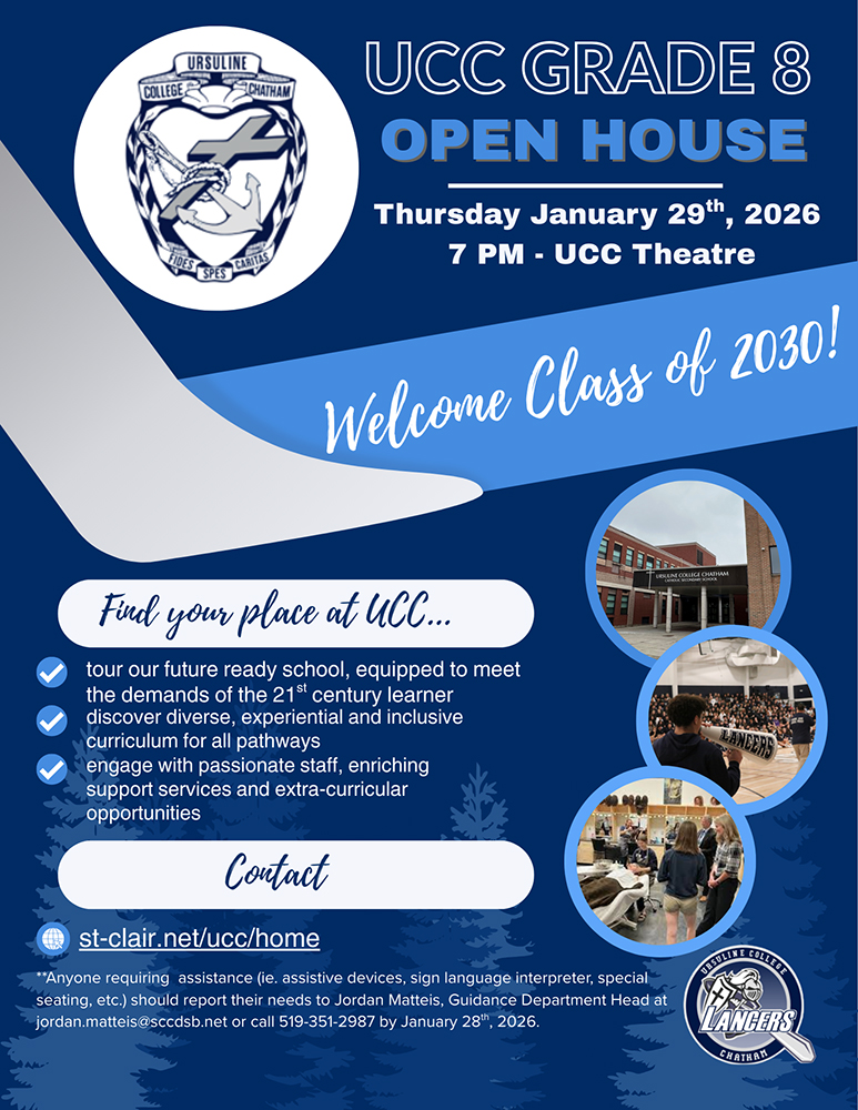 Ursuline College Chatham (UCC) is thrilled to welcome Grade 8 students and their families to our must-attend Annual Open House on Thursday, January 29, 2026, at 7:00 p.m. This is your moment to step inside Chatham-Kent’s Catholic high school of choice and experience firsthand what makes UCC an extraordinary place to learn, grow, and thrive.